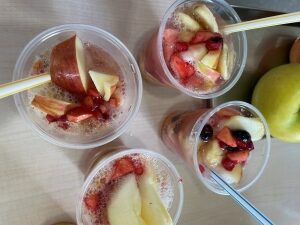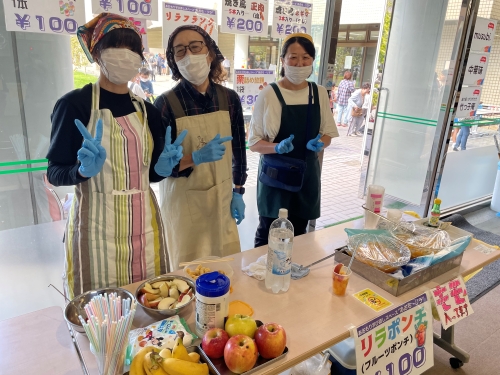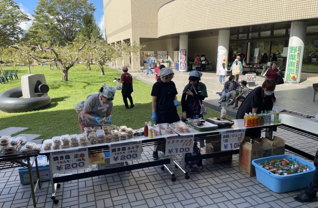 | 2025年9月27日、青森県総合社会教育センター主催の「生涯学習フェア2025」で、あおも・リラの利用者、講師、スタッフ20数名が焼き鳥、フルーツポンチ、ジュ―ス、生栗詰め放題等の出店をしました。あおも・リラについて周知するとともに、多くのお客さんにお越しいただき、用意した商品を完売することができました。 |