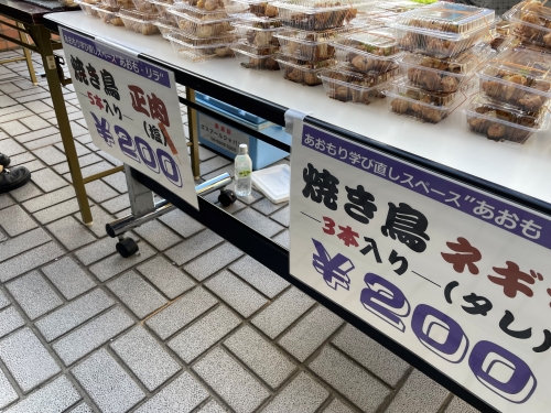 | 2025年7月19日、青森県総合社会教育センター主催のミニイベント「夏休みわらはランド」で、あおも・リラの利用者、講師、スタッフ20数名が焼き鳥、大学イモ、フルーツ串、ジュ―ス、焼きそば等の出店をしました。「わらはランド」の企画をした中学生や来場した子どもたちに喜んでいただきました。 | ||